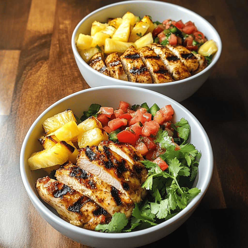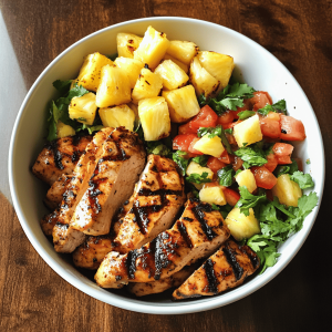 Cette recette, c’est comme un petit voyage sous les tropiques dans ton assiette ! Le contraste entre le poulet épicé, la fraîcheur de la salsa d’ananas et la douceur de l’avocat crée un festival de saveurs qui va mettre du soleil dans ta journée.